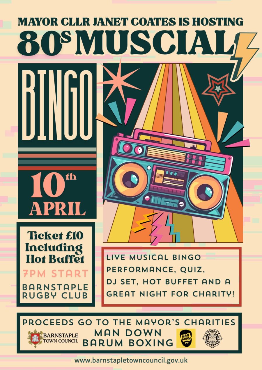 An 80s throwback night is set to bring the curtain down on Barnstaple’s mayoral fundraising year, with music, bingo and a buffet all lined up in aid of two local charities.