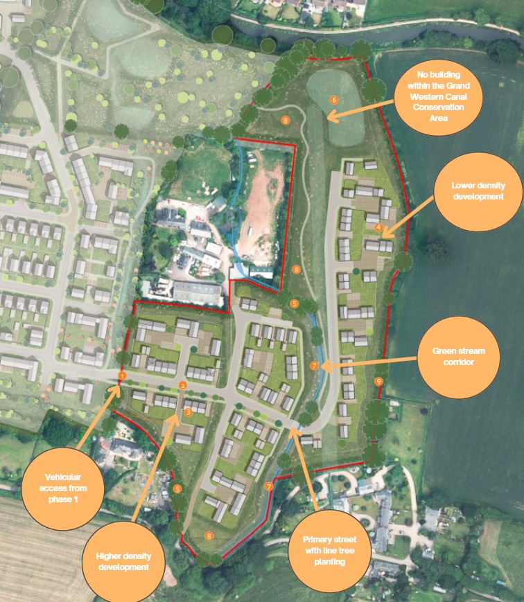 The development is being designed with consideration for the surrounding landscape and nearby heritage assets, including Tidcombe Hall, Tidcombe Farmhouse and the Grand Western Canal Conservation Area. The proposed layout places built development outside the conservation area, with higher-density housing at the centre of the site and lower-density homes towards the edges.