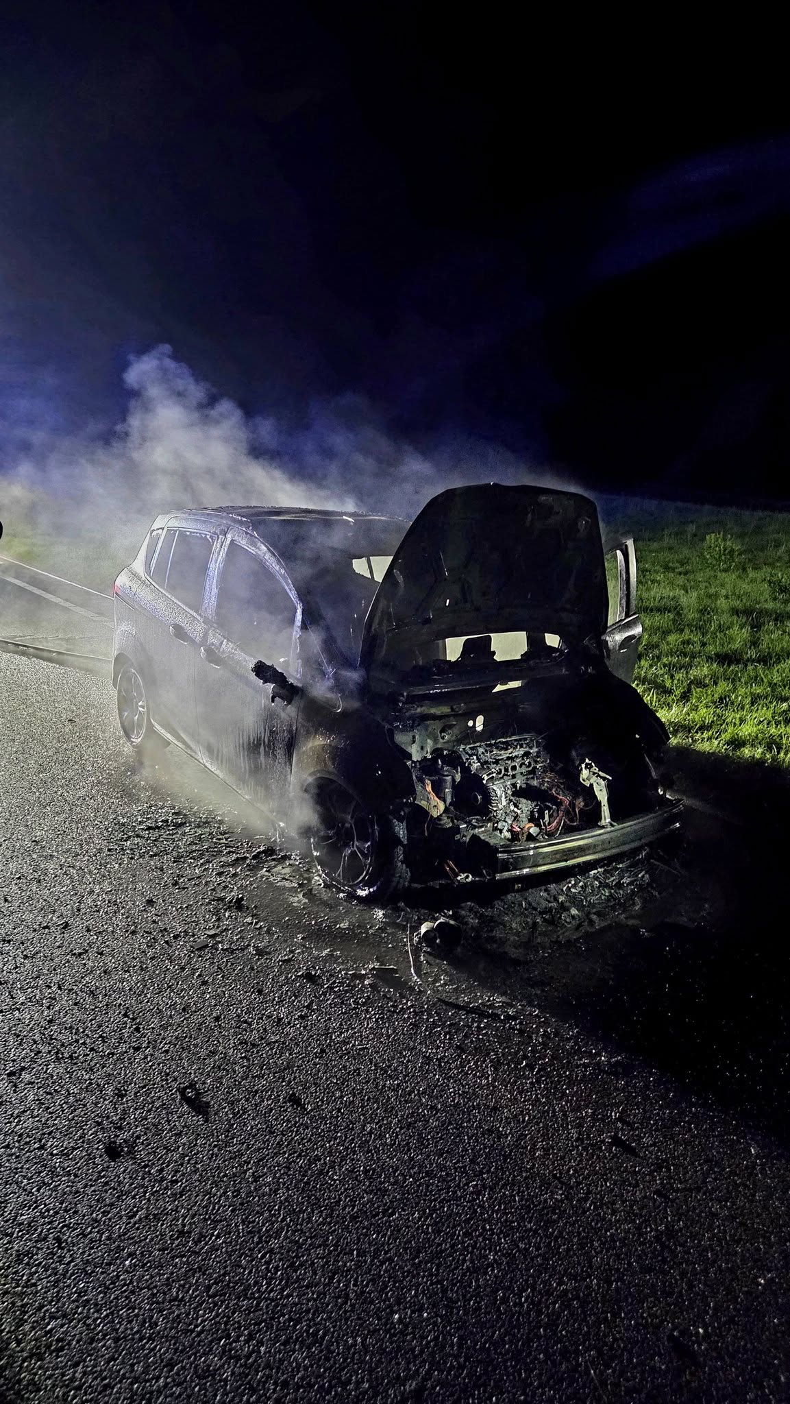 Crews used a hose reel jet to extinguish the fire and deployed battery-operated spreaders to force open the bonnet and doors, ensuring no remaining flames or hot spots.