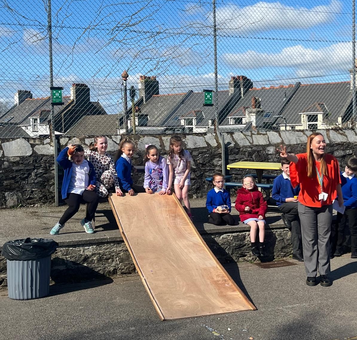 The celebrations continued with an Easter egg race, where pupils entered their decorated “egg people” into a rolling competition in the playground.