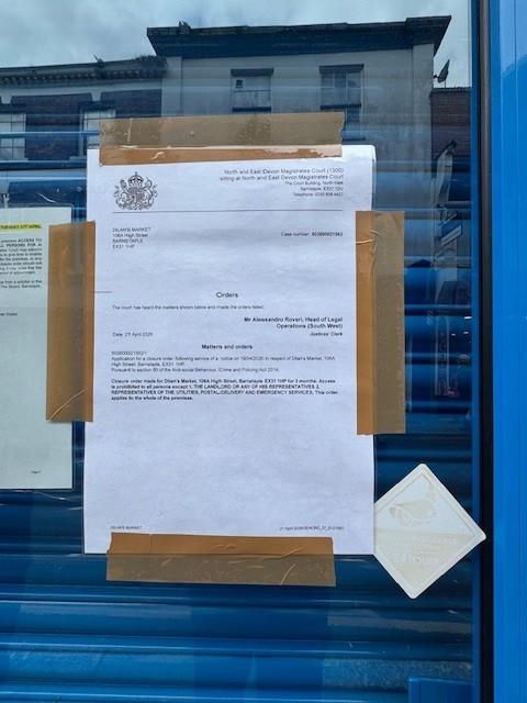 On Tuesday 21 April, North and East Devon Magistrates Court granted a full three-month closure order on Dilan’s Market situated on the High Street in Barnstaple.