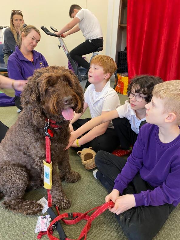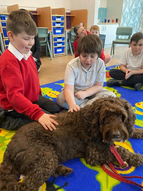 Digby, a seven-year-old brown labradoodle who has been a permanent member of the service since 2018, visited the children to help reduce anxiety and provide reassurance. The visit also formed part of wider educational work to help young people understand fire risks and safety.