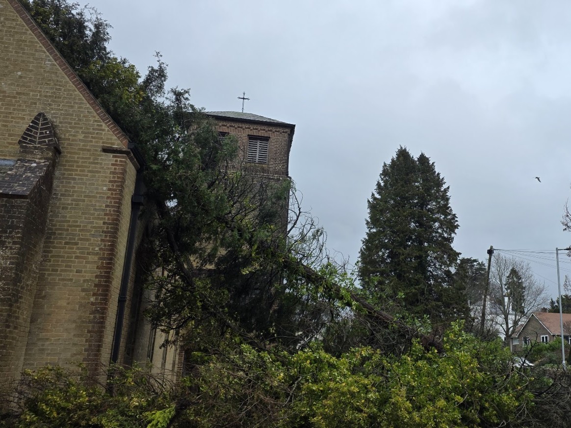 East Devon District Council has confirmed that a windblown Lawson Cypress at the Church of the Holy Family, Roman Catholic Church, Ottery Moor Lane, Honiton, was removed after it fell on to the building during a recent storm.